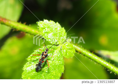 生き物 昆虫 ケブカキベリナガカスミカメ、クロオオアリの体に口吻を突き立てています。食事中?