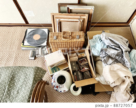 断捨離中の額縁とバスケットとカセットテープや藤椅子など_俯瞰