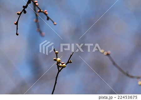 晴天に伸ばした枝に純白の花を咲かせる梅