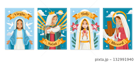 Vertical devotional cards set with virgin mary portraits and text flat cartoon