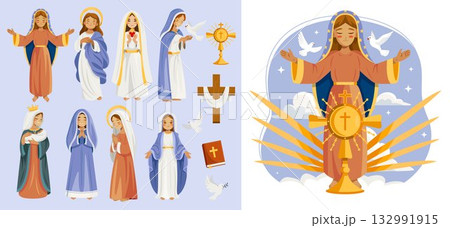 Original set of virgin mary figures and religious symbol illustrations flat cartoon