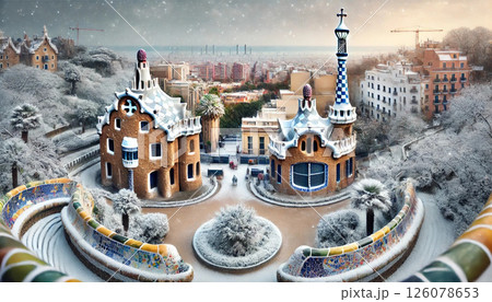 ガウディ通りよりサグラダファミリアを望む 雪景色
