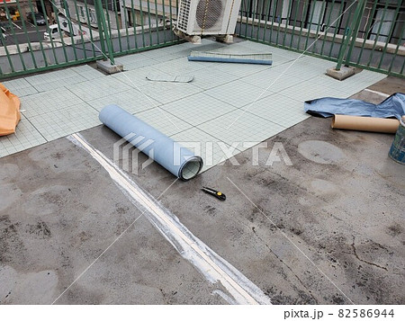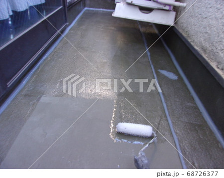 分譲マンションのバルコニーの長尺シート張替え工事にてボンド塗布