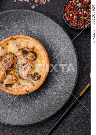 Pie or quiche, a sour tart with chicken and mushrooms, spices and herbs. Round quiche with chicken