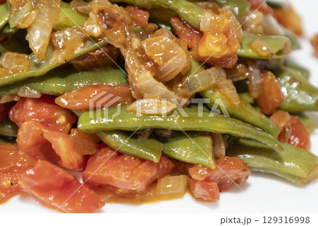Fried green beans with tomato and onion pieces. Tasty meal with french bean on dinner or lunch on the white background