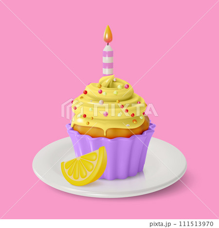 3d Lemon Cupcake with Candle Sweet Dessert Food Cartoon Style Isolated on a White Background. Vector illustration of Muffin with Cream