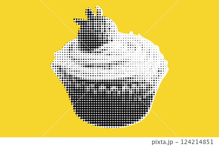 A stylized cupcake with frosting and a decorative topping, set against a bright yellow background. The image features a dotted pattern, giving it a modern and artistic look.