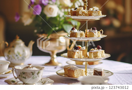 Elegant table setting for tea party with cakes and cupcakes in English manor. Selective focus. Vintage style