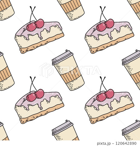 Seamless pattern in doodle style with cheesecake and coffee cup
