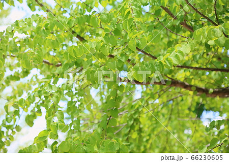 逆光の中で風に揺れる垂れカツラのかわいい若い芽 新緑の垂れカツラ
