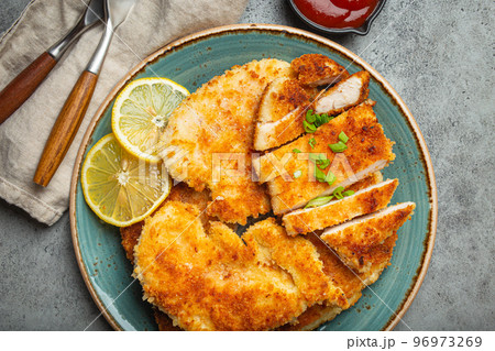 Crispy panko breaded fried chicken fillet with green salad and lemon cut on plate on gray rustic concrete background table with ketchup from above. Japanese style deep fried coated chicken breasts.