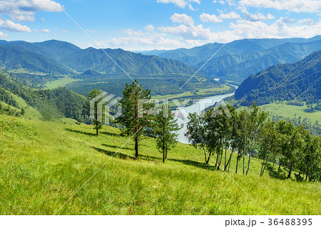 Sunny landscape with Katun River flowing among the mountains on a summer day