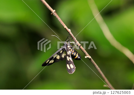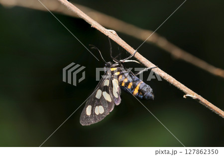 細い枝にとまる可憐なカノコガの成虫(自然環境下昆虫類ストロボマクロ撮影)