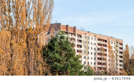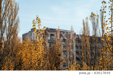 old empty big house on the street of the abandoned city Chernobyl