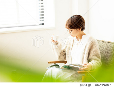 カフェで読書するミドルの女性