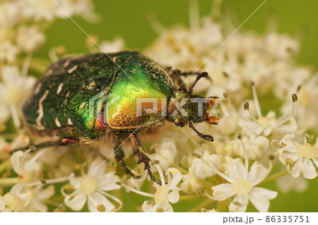 Closeup of the beautiful metallic Emerald beetle, Protaetia pryeri on a white flower