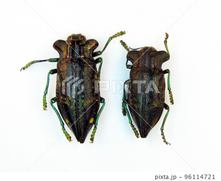 Beetles isolated on white. Unusual shape Polybothris scapularis macro close up, collection insects, coleoptera, buprestidae