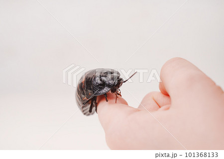 a large hissing Madagascar cockroach in children's hands
