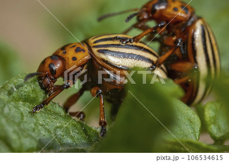 potato cultivation destroyed by larvae and beetles of Colorado potato beetle, Leptinotarsa decemlineata, also known as the Colorado beetle, the ten-striped spearman, the ten-lined potato beetle