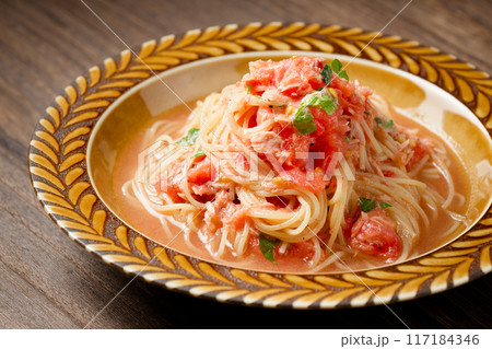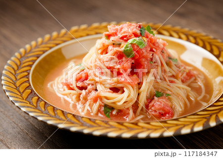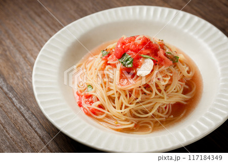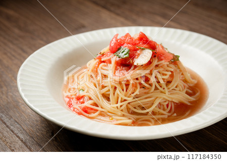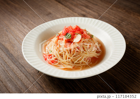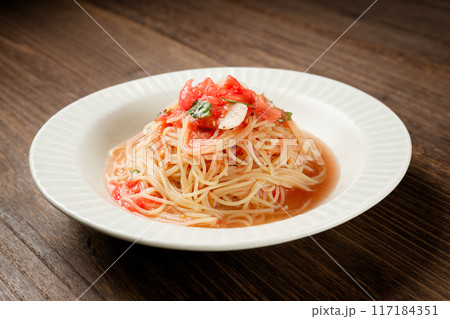 写真素材:トマトとバジルの冷製パスタ(カッペリーニ)