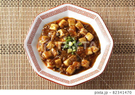 お豆腐がたくさん入っている四川風麻婆豆腐を俯瞰で撮影