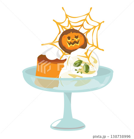 Set of ice cream and cookies with halloween character face on orange background. Halloween party background