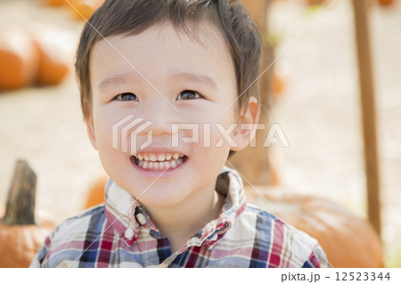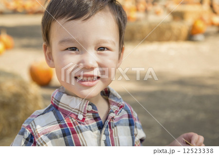 Mixed Race Young Boy Having Fun at the Pumpkin Patch