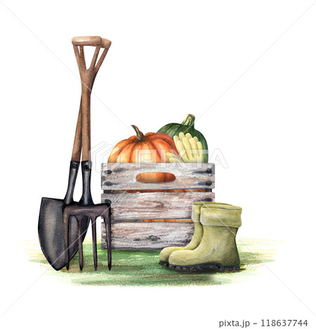 Composition with vintage wooden crate, box with pumpkins, gumboots, gardening gloves and spade, shovel, pitchfork on the ground. Watercolor illustration isolated on white. For clipart label package