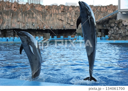 八景島シーパラダイスで一斉にジャンプするカマイルカ