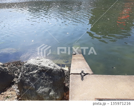 red-eared turtles, or California, Trachemys scripta, sunbathing on a rock on the shore of a lake in Mallorca, invasive species of the lagoon