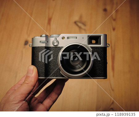 クラシックデザインのデジタルカメラを手に取ったPOV — 新製品と美しいパイン材の背景