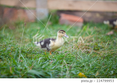 Little duckling of Muscovy duck at cloudy day in autumn