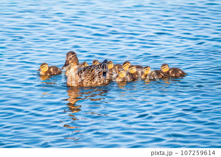 A family of ducks, a duck and its little ducklings are swimming in the water. The duck takes care of its newborn ducklings. Mallard, lat. Anas platyrhynchos