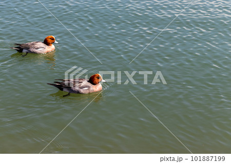 水面を泳ぐ二羽のヒドリガモ