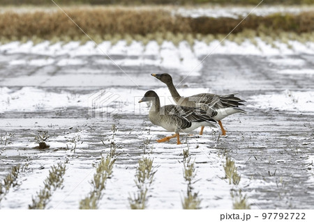 真冬に東北の田んぼに渡来する大きなガンの仲間のヒシクイ