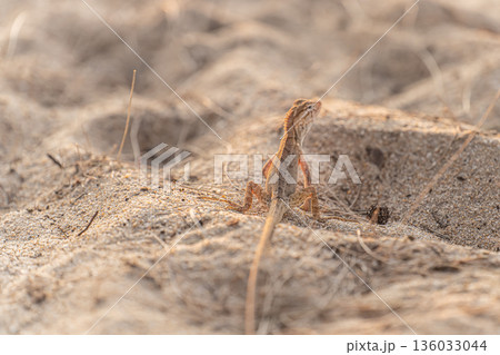 Oriental garden lizard or Thai chameleon in the sand close-up on a beach in Thailand. Lizard small dragon rear view on the beach, long tail. High quality photo