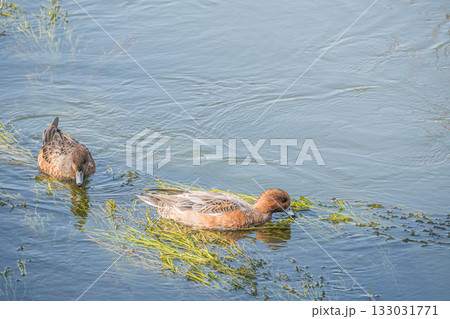 水草を食べるヒドリガモ(メス) 琵琶湖疏水 京都市