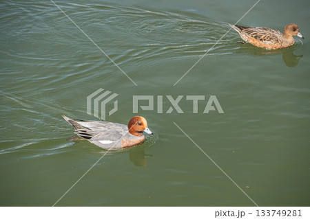 琵琶湖疏水を泳ぐヒドリガモ(オスとメス) 京都市