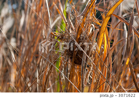 ゆずの里毛呂山町の里山で古代米の稲に出来た日本一小さなカヤネズミの珍しい巣と稲架掛けの風景