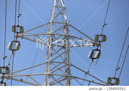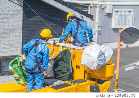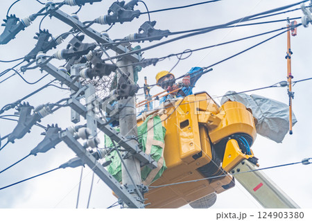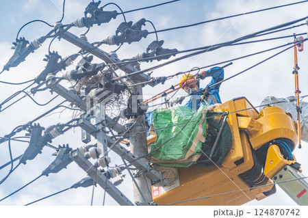 高所作業車 電柱にあるカラスの巣の撤去作業準備をする保守管理作業員