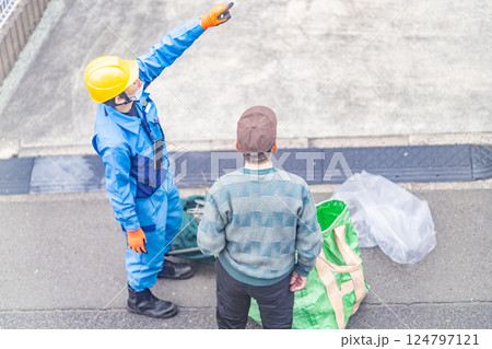 電柱上にあるカラスの巣を撤去した保守管理作業員から状況を聞く近隣住民 高齢男性
