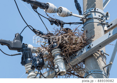 カラスの巣 電柱の上に烏の巣 撤去作業 停電原因