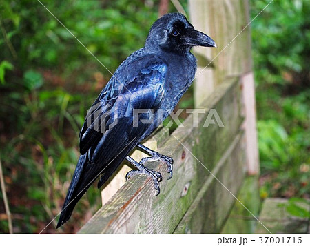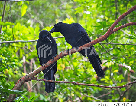 生き物 野鳥 オサハシブトガラス、緑の中で食事中。十月の石垣島で