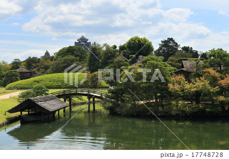 岡山後楽園、慈眼堂前から見る沢の池の中の島と岡山城