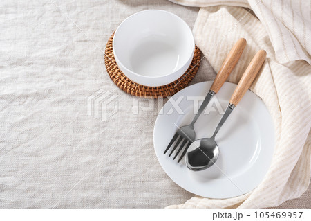 White plate and bowl with spoon and fork with linen napkin on tablecloth background with copy space