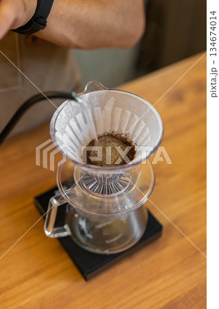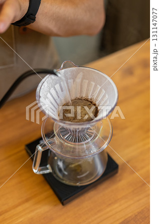 A person pours hot water over coffee grounds in a pour-over coffee maker. The setup includes a glass carafe and a wooden table surface.