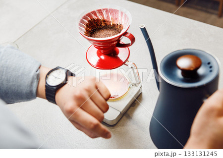 Brewing Drip Coffee in Modern Bright Kitchen With a Kettle with Thin Spout Electric Scale Ready for Measurement