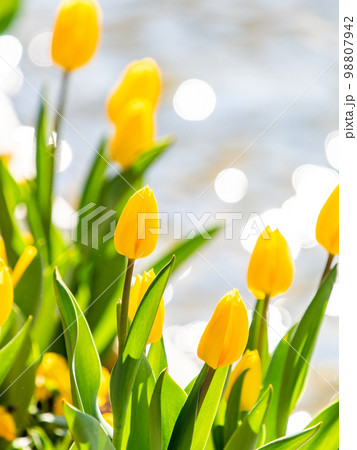 煌めく噴水と満開の黄色いチューリップの爽やかな景色