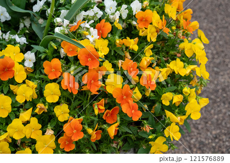 オレンジと黄色のビオラが咲き誇る花壇のクローズアップ