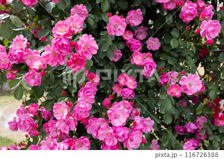 ガーデンで咲く美しいピンクのカップ咲きのバラの花